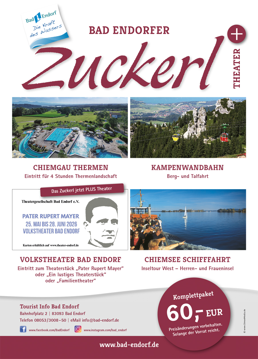 Mit unseren Kombitickets, wie dem Bad Endorfer Zuckerl, dem Zuckerl+ und dem Gipfel Hoch 4 Plus Ticket, können Sie nicht nur ordentlich sparen, sondern auch die wichtigsten Sehenswürdigkeiten der Region entdecken. Alle drei Pauschalangebote sind in der Tourist Information Bad Endorf am Bahnhofsplatz erhältlich. Informieren Sie sich hier.