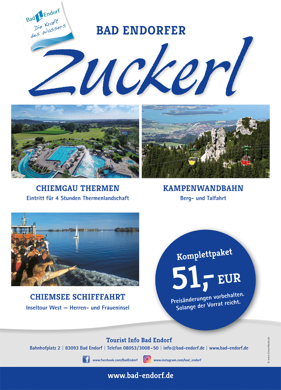 Das Bad Endorfer Zuckerl beinhaltet einen 4-stündigen Eintritt in die Chiemgau Thermen, eine Chiemsee-Schifffahrt zur Herren- und Fraueninsel sowie die Berg- und Talfahrt mit der Kampenwandbahn.